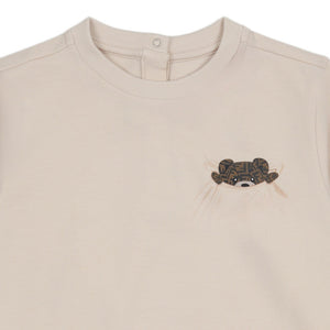 Beige sweatshirt by luxury brand Fendi, made in soft cotton jersey. Combining playful charm with comfort, it has a delightful Fendi bear motif on the chest and signature Fendi Roma embroidery on one sleeve. There are sporty striped trims and useful popper fastenings on the back to help with dressing.