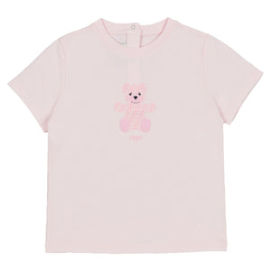 This soft pink Fendi t-shirt features an exclusive graphic of the FF logo forming a teddy bear. A cute and comfortable designer top for infants.