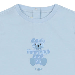 This soft light blue Fendi t-shirt features an exclusive graphic of the FF logo forming a teddy bear. A cute and comfortable designer top for infants.