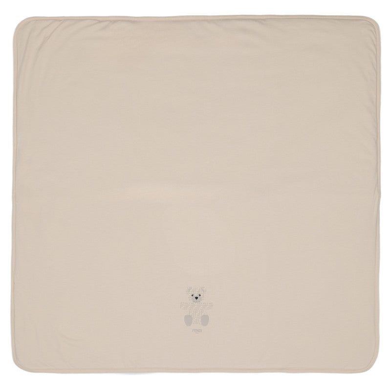 Beige blanket for baby boys and girls by luxury Italian brand Fendi, made in soft cotton jersey. The front features an adorable Fendi bear motif, patterned with signature FF logo detailing, with a matching, all-over FF logo pattern on the reverse.