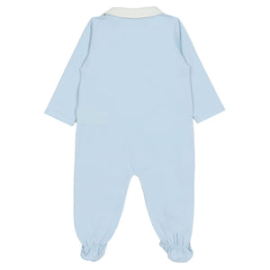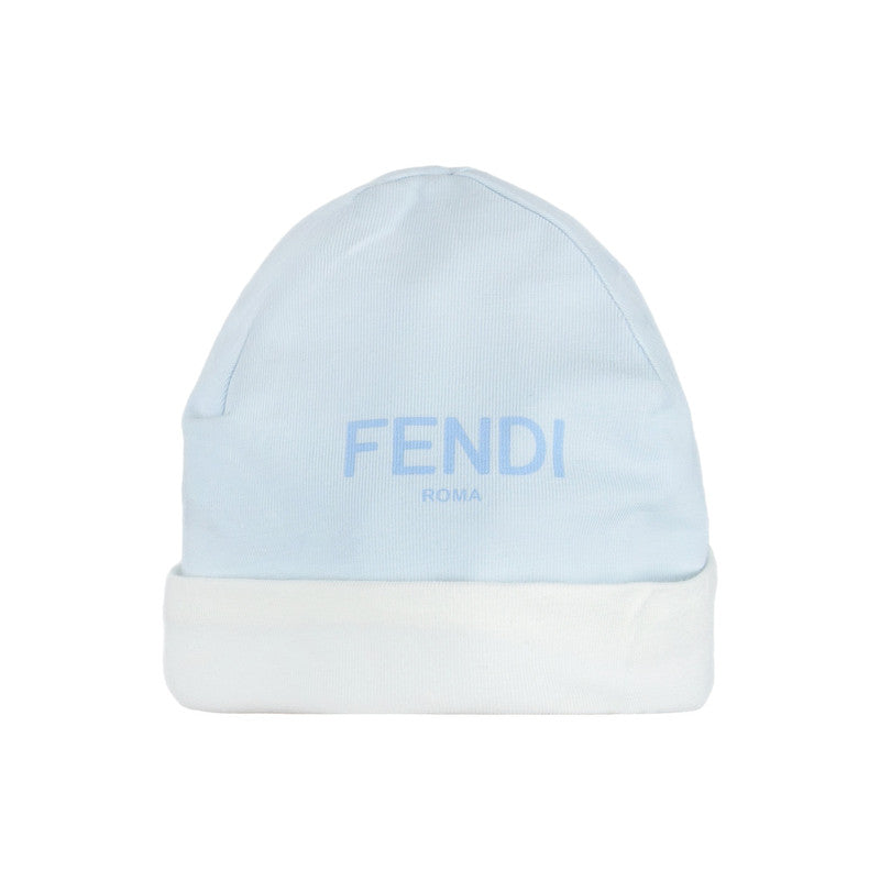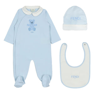 This light blue babygrow set for boys by Fendi features a charming bear motif adorned with the signature FF logo. Including a babygrow, hat, and bib, each piece is made in soft cotton jersey, ensuring all-day comfort. The babygrow has a white Peter Pan collar and concealed front popper fastenings for easy wear. The matching hat has a turned-up brim and the bib has an absorbent towelling lining. All pieces are printed with the designer's logo for instant brand appeal.