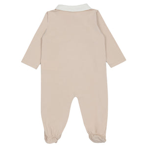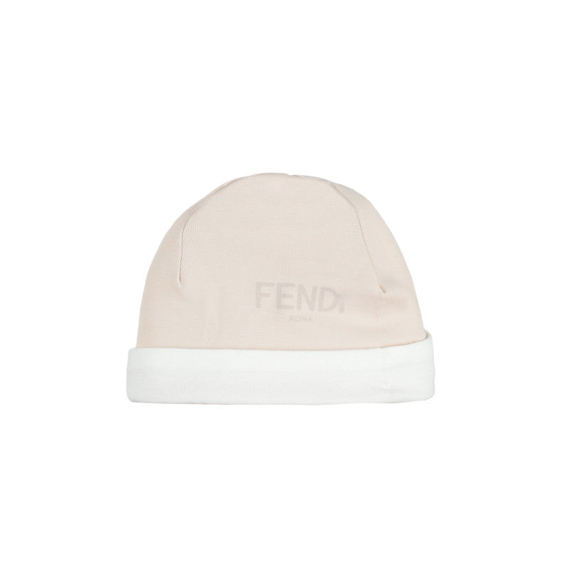 This beige babygrow set by Fendi features a charming bear motif adorned with the signature FF logo. Including a babygrow, hat, and bib, each piece is made in soft cotton jersey, ensuring all-day comfort. The babygrow has a white Peter Pan collar and concealed front popper fastenings for easy wear. The matching hat has a turned-up brim and the bib has an absorbent towelling lining. All pieces are printed with the designer's logo for instant brand appeal.