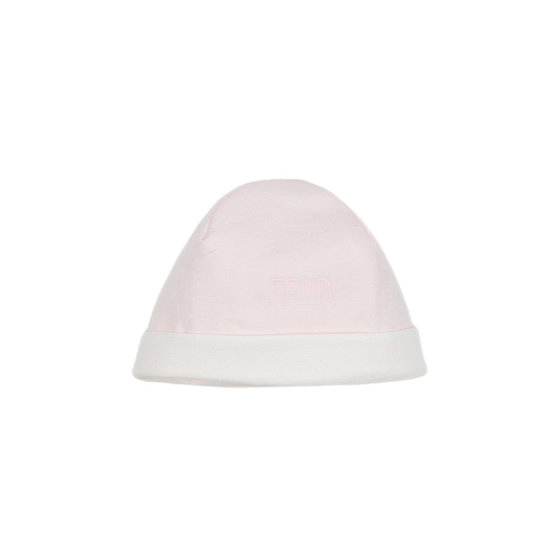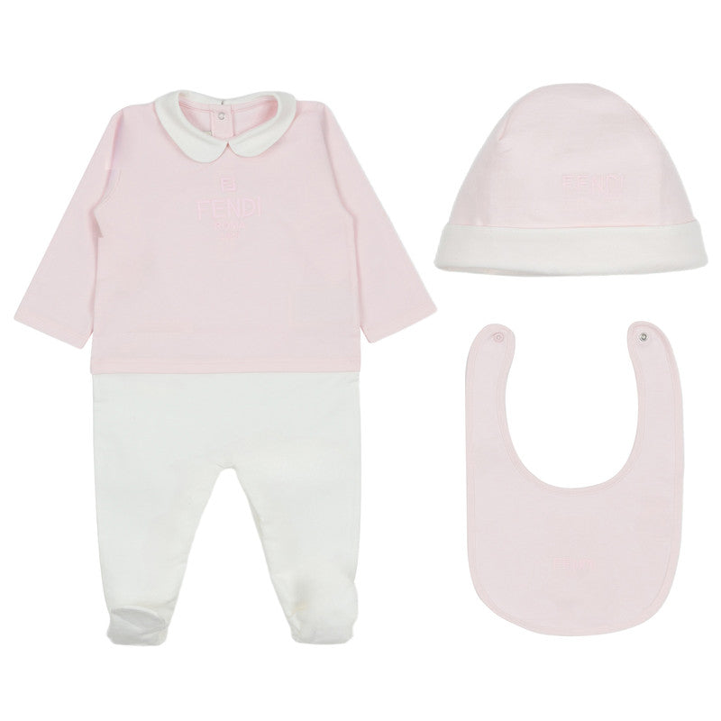 A charming three-piece Fendi baby set in pink and white. Includes a collared all-in-one, beanie hat, and bib, all featuring the signature Fendi logo.