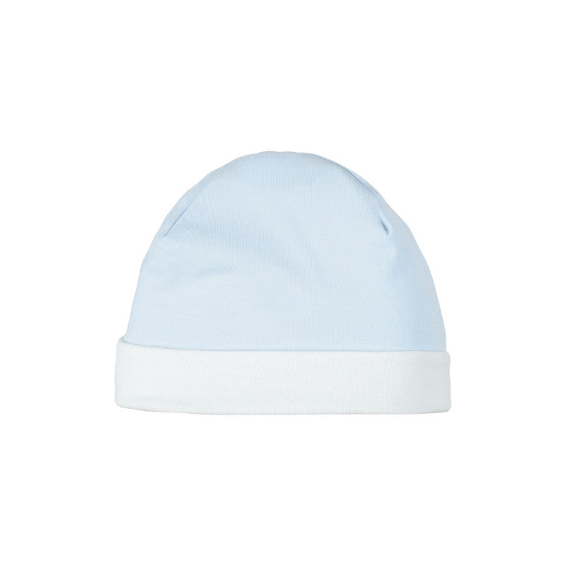A charming three-piece Fendi baby set in blue and white. Includes a collared all-in-one, beanie hat, and bib, all featuring the signature Fendi logo.