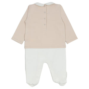 A charming three-piece Fendi baby set in beige and white. Includes a collared all-in-one, beanie hat, and bib, all featuring the signature Fendi logo.