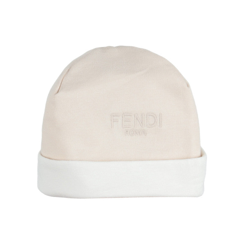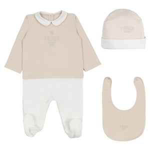 A charming three-piece Fendi baby set in beige and white. Includes a collared all-in-one, beanie hat, and bib, all featuring the signature Fendi logo.