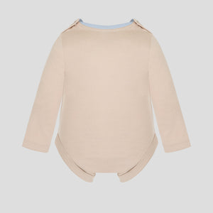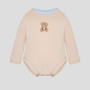 Crafted from soft, natural cotton, this beige Teddy Bodysuit offers gentle comfort for your baby boy. The delicate applique detail adds subtle charm, while the blue piping at the collar provides an elegant contrast. Designed for everyday wear, it combines style and practicality with breathable fabric and easy dressing features.