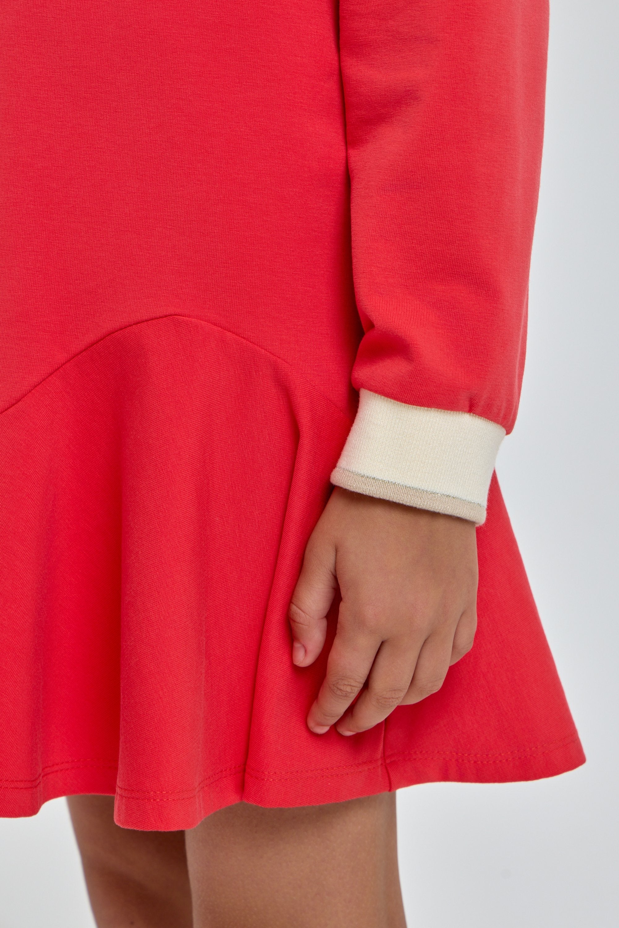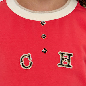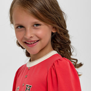 This refined jersey dress for girls features intricate CH embroidery, combining soft, breathable fabric with elegant detailing. Its comfortable fit and sophisticated design make it an ideal choice for both everyday wear and special occasions.