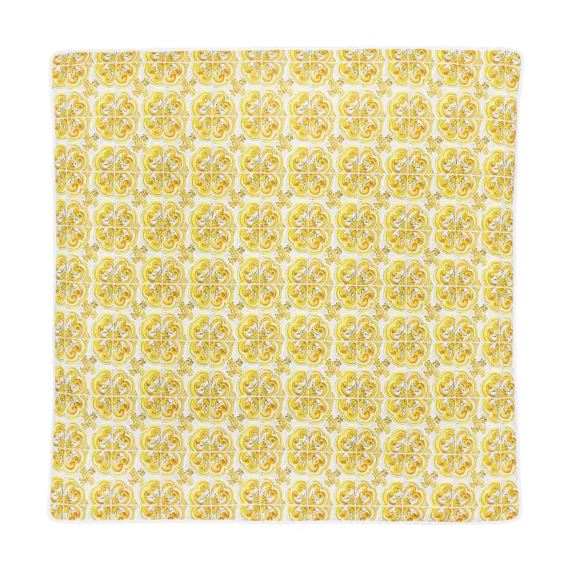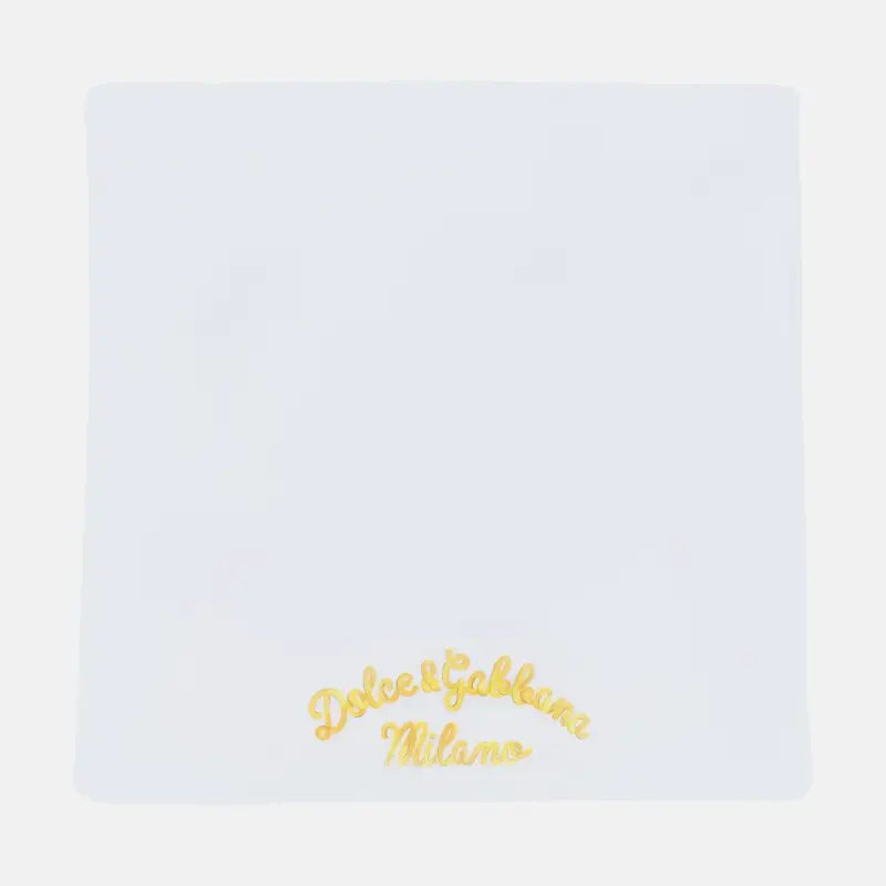 A vibrant yellow and white cotton blanket for baby boys and girls by luxury Italian label Dolce & Gabbana. Lightly padded for comfort, this lovely nursery accessory is patterned on one side with the brand's Sicilian inspired, Majolica tiled design. The reverse has a bold script logo print for extra designer appeal.