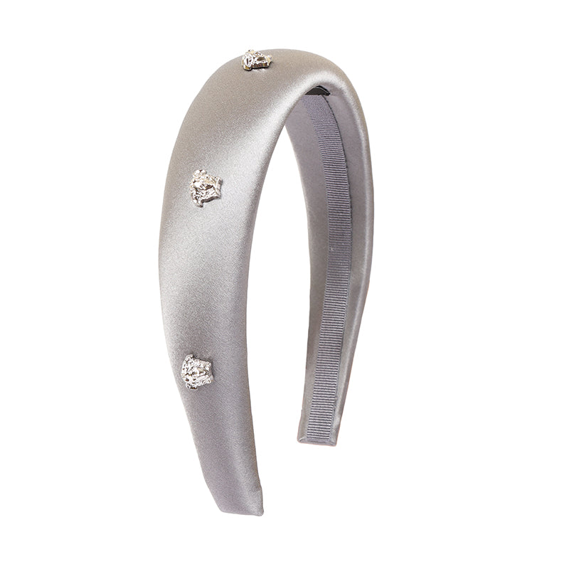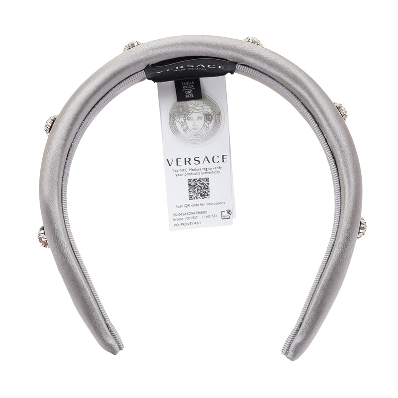 Grey silk embellished silk headband from Versace Kids featuring quilted, silver-tone stud detailing and metallic effect.