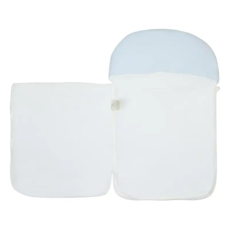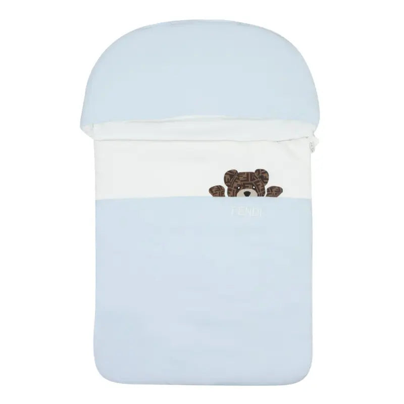 Fendi Blue baby nest for baby boys. Made from soft premium padded cotton, it features the brands logo applique and embroidered in white and teddy bear print on the front. It opens fully with a side zip.