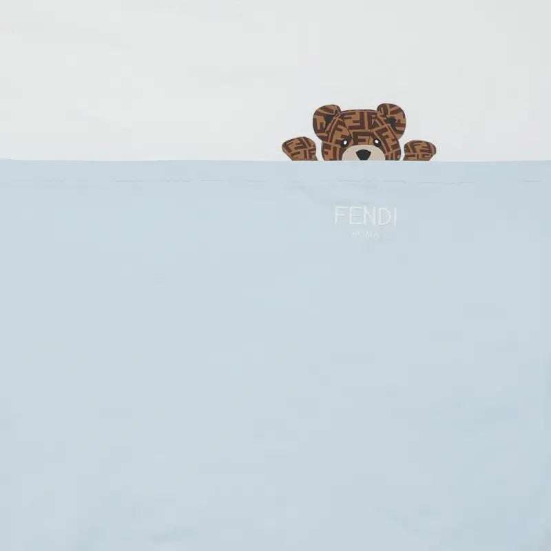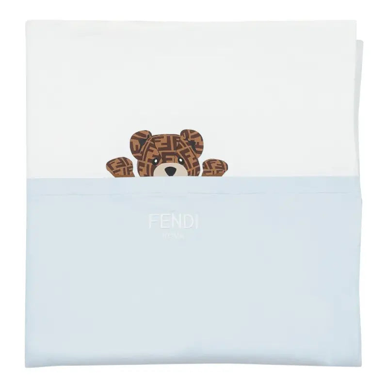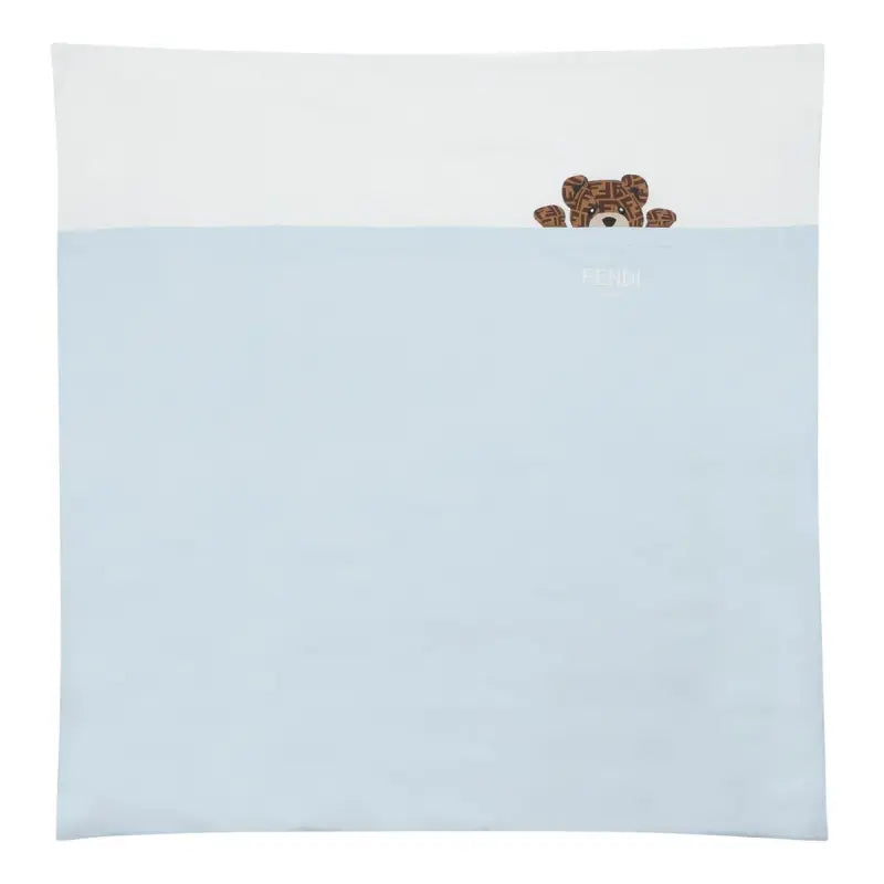 Blue and ivory blanket for baby boys by Italian luxury designer brand Fendi. Made from soft padded cotton. Features the embroidered brand logo in white and teddy bear print on the front. It has a ivory panel and plain ivory on the reverse.
