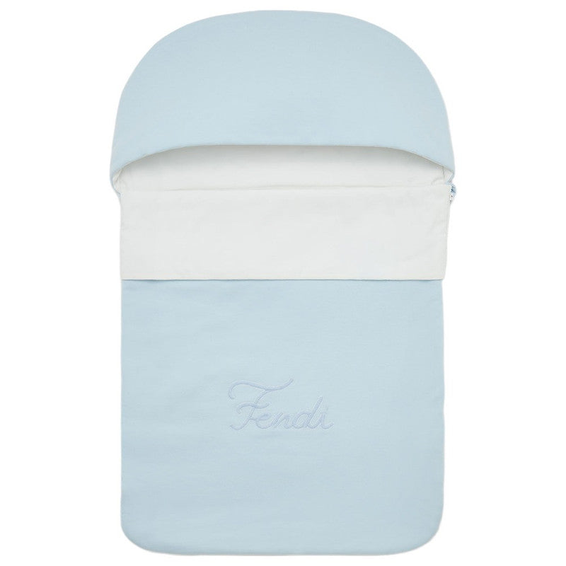 Baby sleeping bag in blue jersey with white border and tone-on-tone Fendi embroidery on the front.