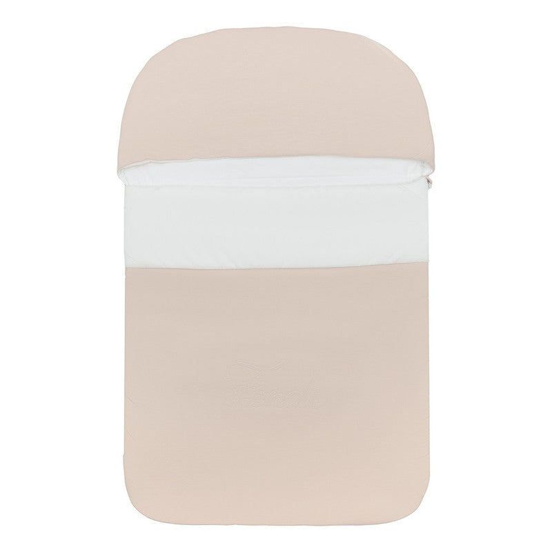 Baby sleeping bag in beige jersey with white border and tone-on-tone Fendi embroidery on the front.