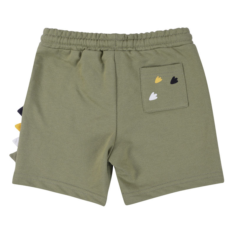 Playful green shorts for baby boys by Mayoral, made in the softest cotton jersey. They have a dinosaur printed with the words 'DINO' on the front, and spike appliqués on the side. Designed for comfort, they have an elasticated drawstring waistband and a pocket on the back with footprints.