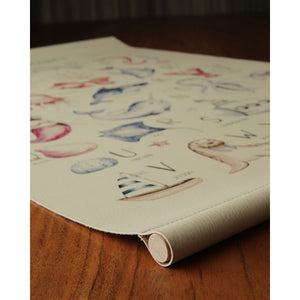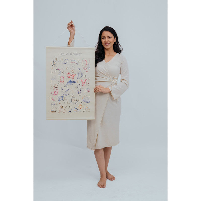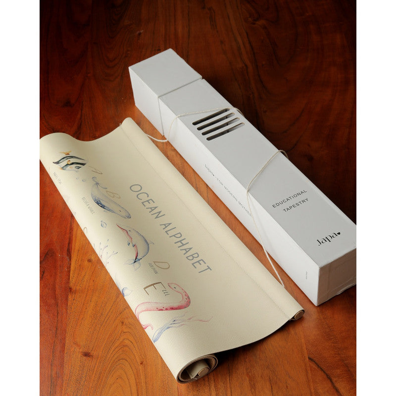 Ethically crafted with premium vegan leather. Sustainable fruit skin and cork composition. Water and stain-resistant. PVC and lead-free. Baby-safe and GOT certified. Ocean-themed alphabet design encourages learning and imagination.