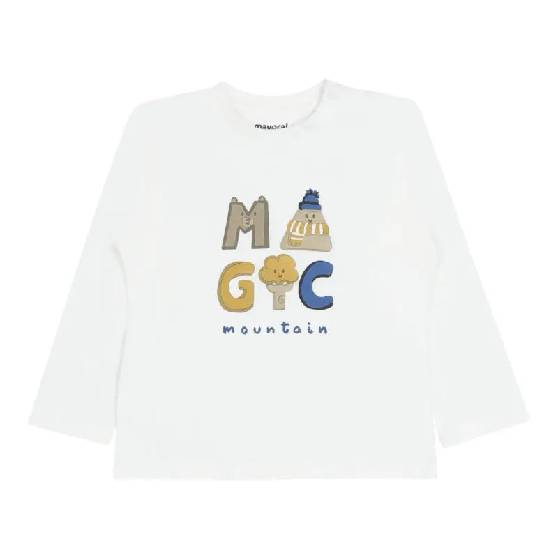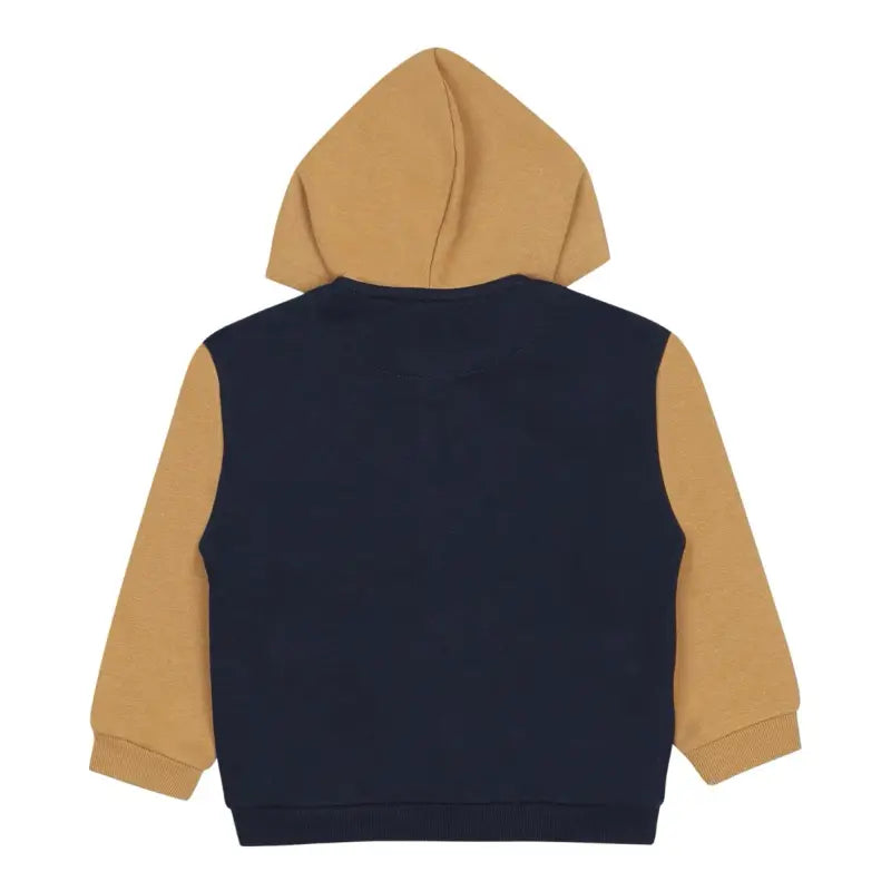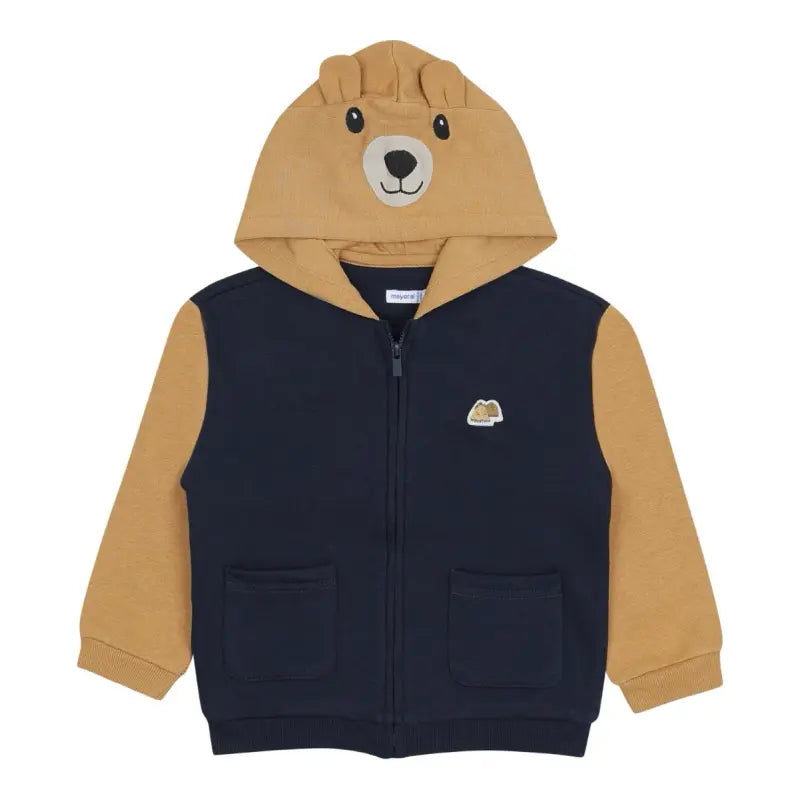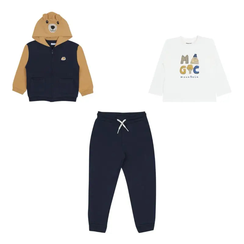 A comfortable blue cotton tracksuit by Mayoral, with a white top to complete the outfit. The zip-up top has a bear face with 3D ears on the hood for a cute finish.