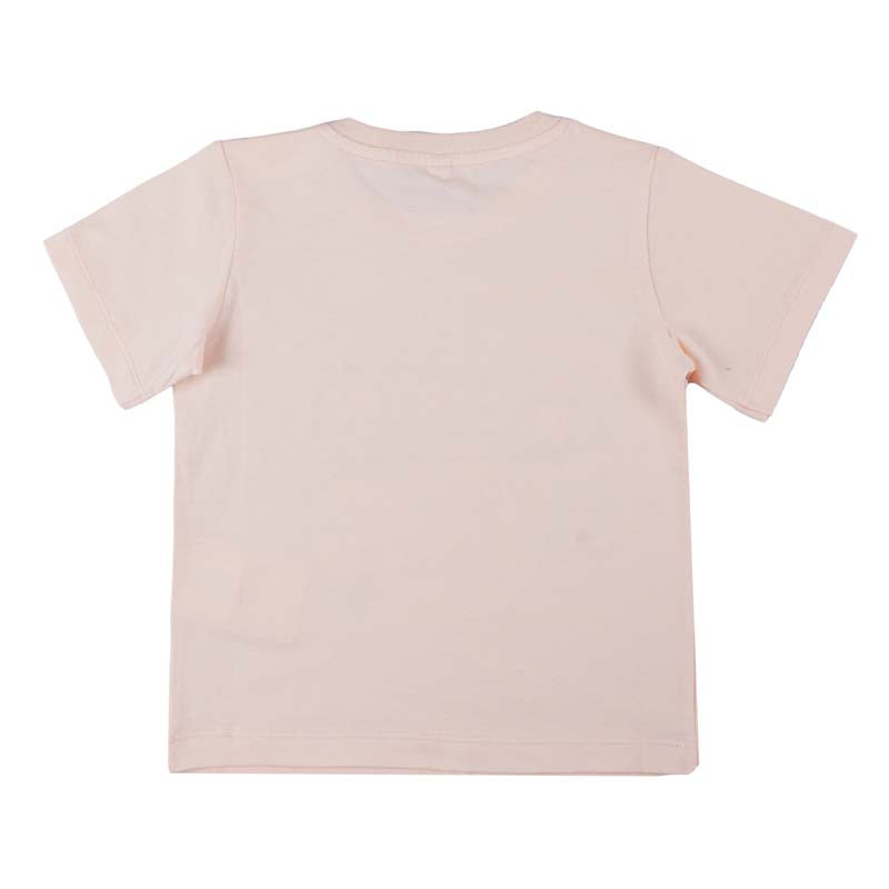 Peach T-shirt for girls by Stella McCartney Kids, made from soft organic cotton jersey. With a ribbed crew neck, this easy-to-wear piece has a vibrant logo print on the front featuring a rainbow, a striped guitar and colourful stars. It is finished with turn-up cuffs for a casual look.