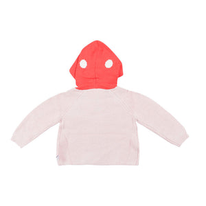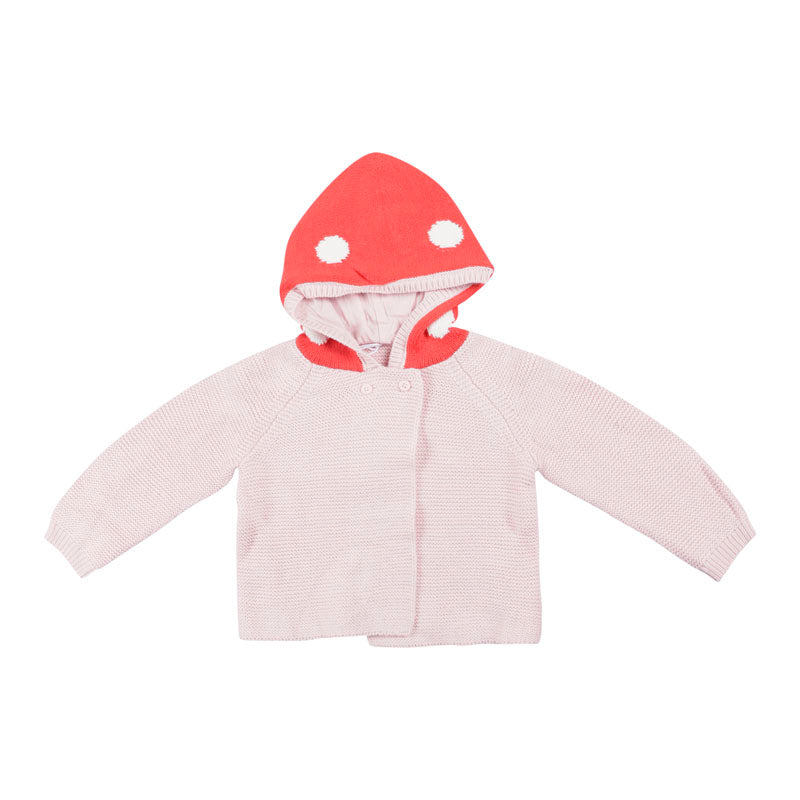 Younger girls pink knitted hooded cardigan by Stella McCartney Kids. In a lovely cable knit, it is soft and warm, with button fastening at the neck. The fixed hood has a red knitted mushroom pattern and it is lined in jersey.