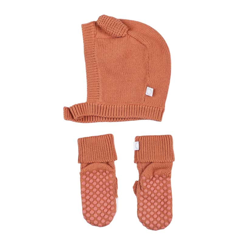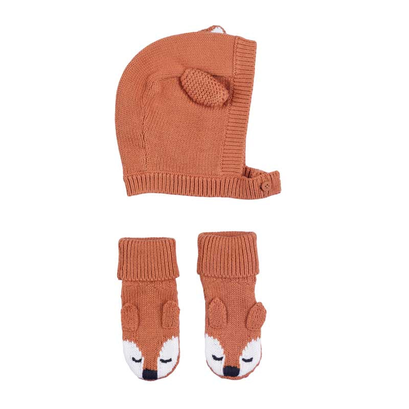 Brown set in cotton and wool, composed of hat and socks. Hat with ribbed profile and button closure on the front, it is embellished with ears on the front. Mittens with ribbed and non-slip cuffs, embellished with fox on the front.