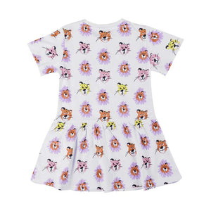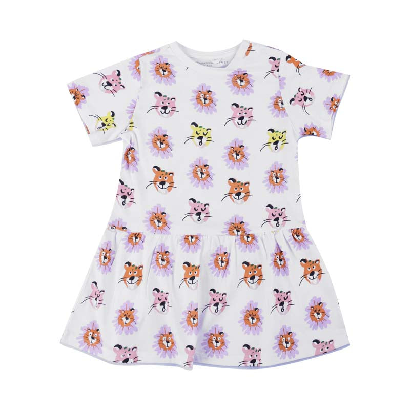 Cute white organic cotton dress for little girls by Stella McCartney Kids, with a colourful big cats print. It has a ribbed neckline and a dropped waist with a gathered skirt below. Made in comfortable jersey with easy-to-use poppers on one shoulder, it is ideal for relaxed days.