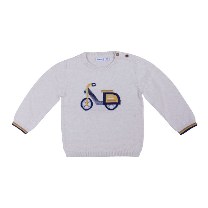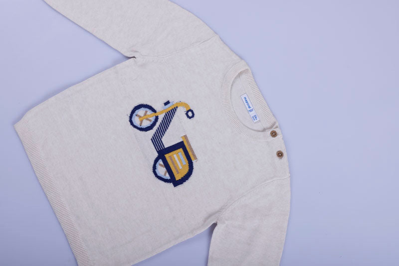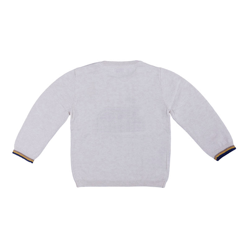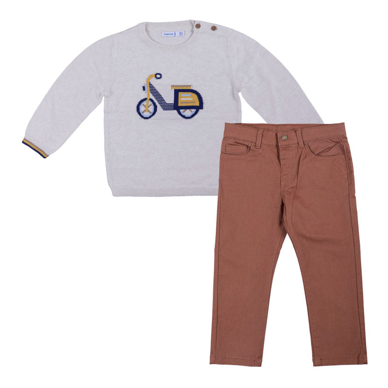 Original two-piece set for baby. Long sleeved jumper for baby. Buttons fastenings on the shoulder. Slim fit trousers for baby which fit well to the figure. Snap-button fastening on the front. Faux flies. 60% COTTON 30% POLYAMIDE 10% WOOL