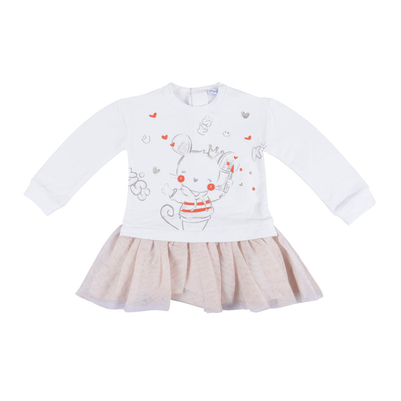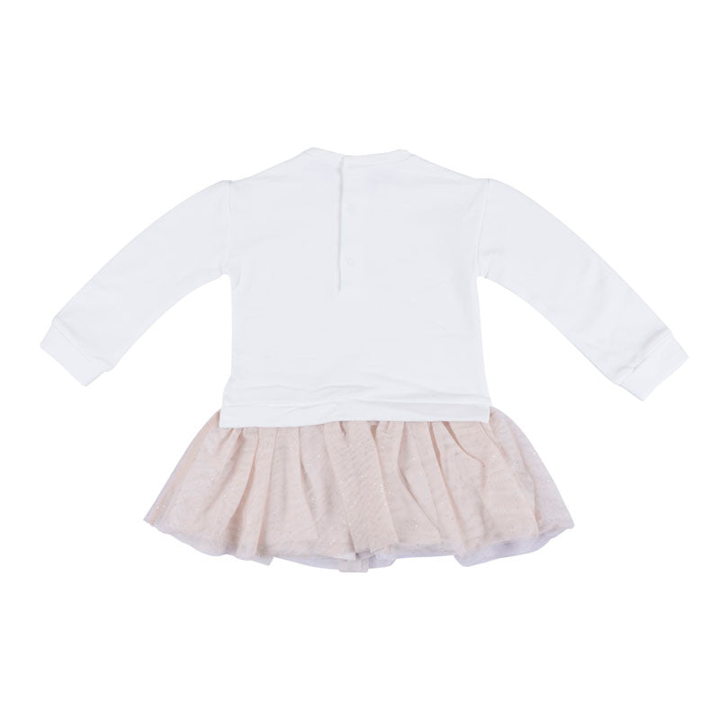 Long sleeved dress for baby. Designed with non-detachable pullover. Small opening on the back with a button fastening to allow the garment to be put on easily. 76% COTTON 20% POLYESTER 4% ELASTANE
