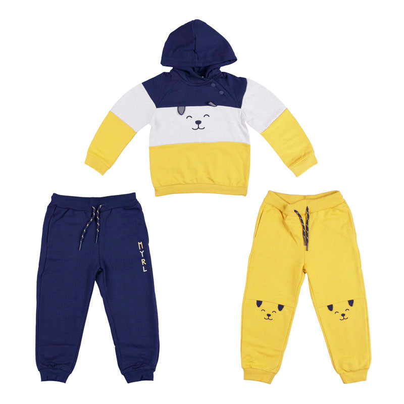 Three piece tracksuit for baby made up of a hoodie, and two pairs of jogging bottoms. Long sleeved hoodie for baby. Snap-button fastenings on the shoulder to allow the Garment to be put on easily. Trousers for baby from our sporty range, made with flexible material so they can be worn for playing and being active. Adjustable elasticated waistband to fit the waistline perfectly. Knees reinforced on the inside, specially designed to provide greater resistance in the area of most wear and tear. 60% Cotton 39% Polyester 1% Elastane