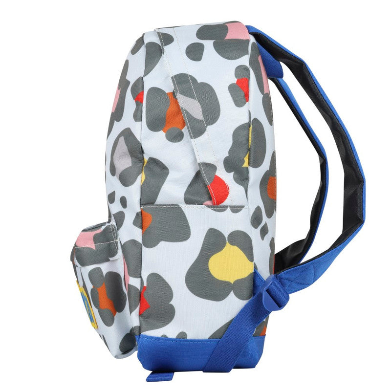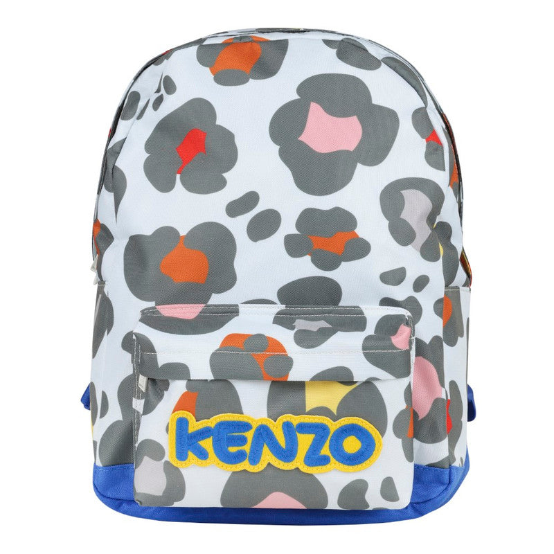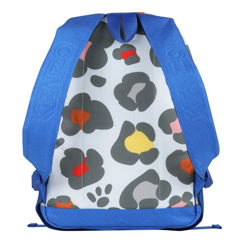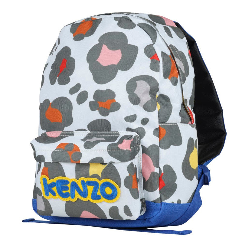 Designed by KENZO KIDS, a grey animal print backpack with vibrant blue trims and an embroidered yellow and blue Kenzo logo. Suitable for boys and girls this fun bag has a roomy main compartment, with a small inside pocket and a handy name tag, ideal for school or when out and about. There is a smaller zip fastening front pocket, a woven carry handle, and lightly padded adjustable shoulder straps for a comfortable fit.
