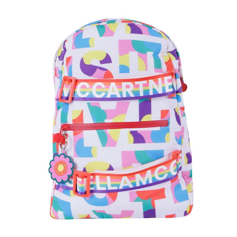 Rainbow graphic-print backpack from STELLA MCCARTNEY KIDS featuring white/multicolour, all-over graphic print, flower charm, strap detailing, all-around zip fastening, front pouch pocket, single flat top handle and adjustable shoulder straps.