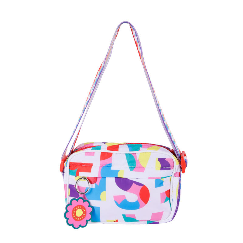 White bag by British brand Stella McCartney , it has all-over colorful letter print, single rainbow logo adjustable strap and top zip for main compartment. They have front zip with keyring.