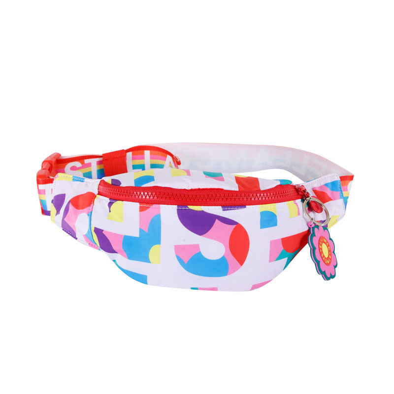 White belt bag by by British brand Stella McCartney. Made from soft polyester with an all-over colorful letter print. Fastens with red zip and it has an flower keyring. Finished with adjustable red plastic buckle strap.