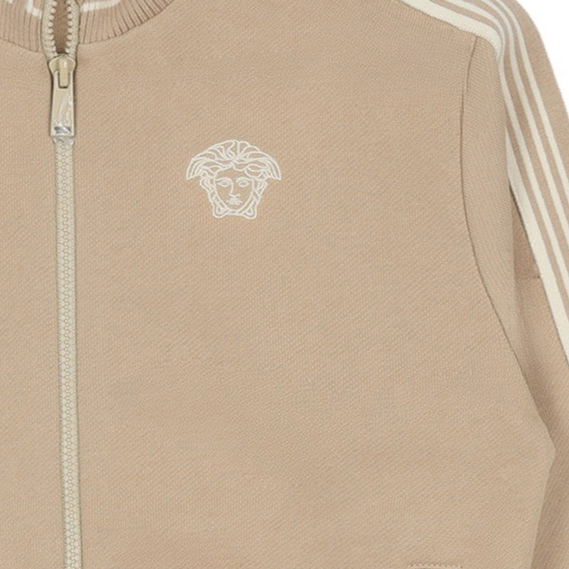 Beige zip-up top by Versace, with sporty ivory stripes on the sleeves. For a signature look, it has the luxury Italian label's Greca motif around the ribbed collar and an embroidered Medusa logo on the chest.