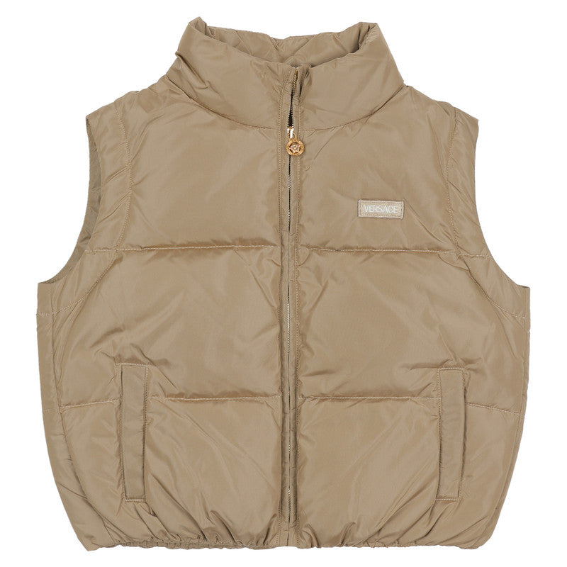 This sleeveless padded puffer vest features an embroidered Versace Logo label at the chest and a silk twill Barocco Foulard printed lining. The outerwear style is accented by a Medusa Biggie zip puller.