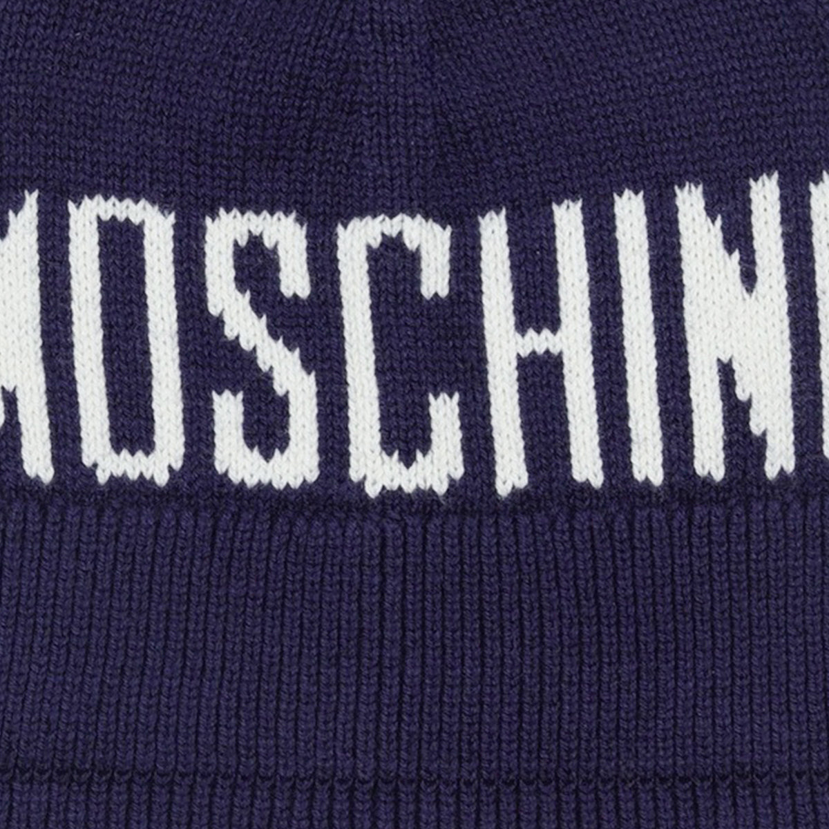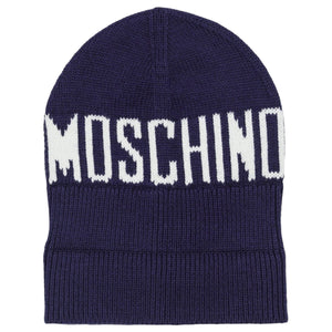 Keep Your Little One's Head Warm And Stylish With This Navy Blue Moschino Knit Beanie. Made From Soft, Comfortable Material, This Hat Features The Moschino Logo Boldly Knitted In Contrasting White Across The Front. The Ribbed Cuff Ensures A Secure And Cozy Fit, Making It A Perfect Accessory For Colder Days.