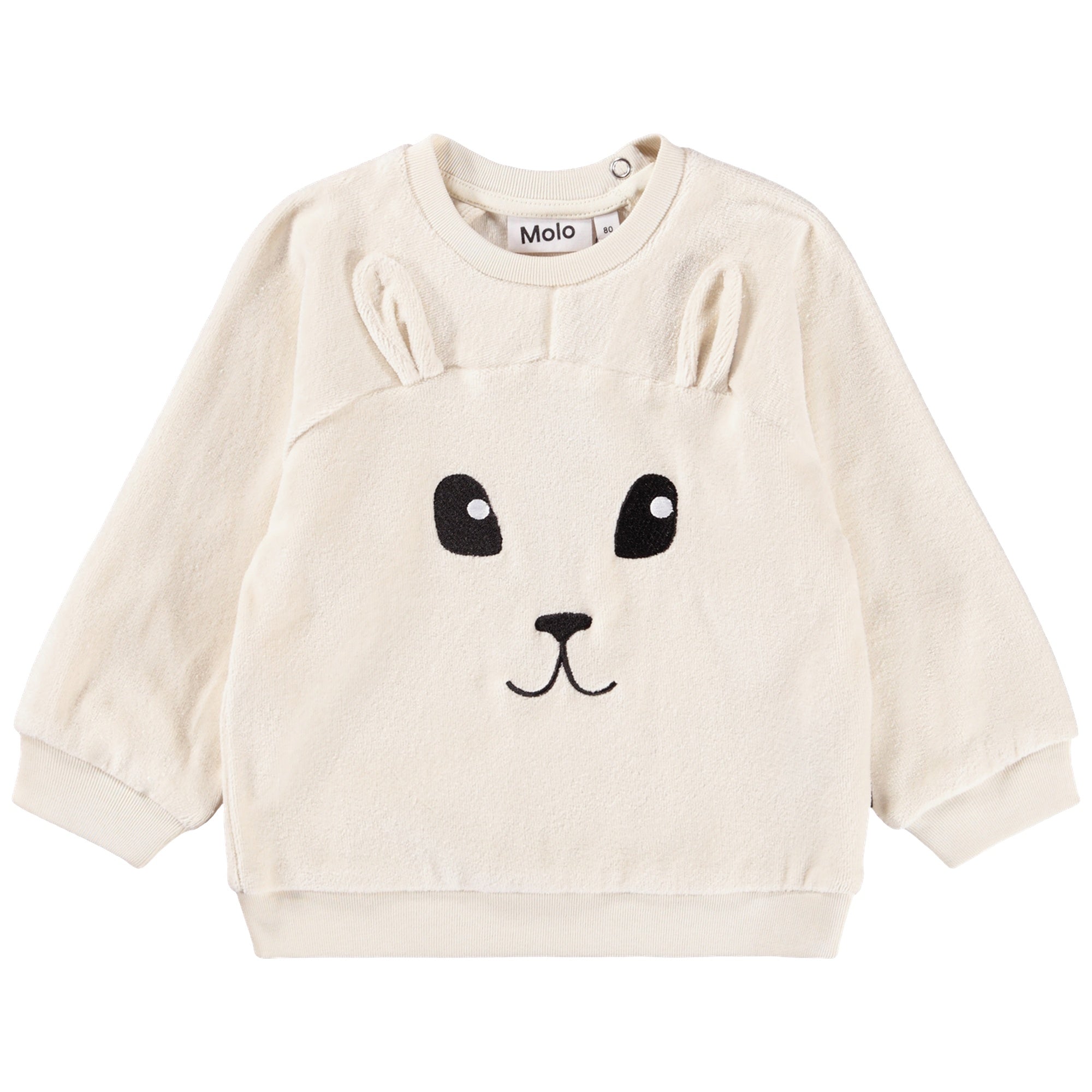 Ivory velour sweatshirt by Molo, made in soft organic cotton. This cosy top features a cute embroidered animal face on the front, with 3D ears for added playfulness. It has a ribbed hem and cuffs and raglan sleeves with popper fastenings on the back of one shoulder for easy dressing.
