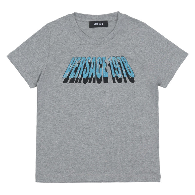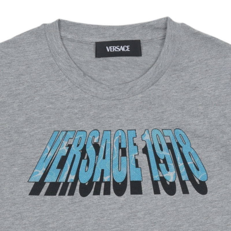 This comfortable grey t-shirt is a casual staple with a designer edge. It features a bold, graphic "VERSACE 1978" print across the chest in striking blue and black tones. Made from soft cotton, this tee brings throwback style and luxury to everyday wear.
