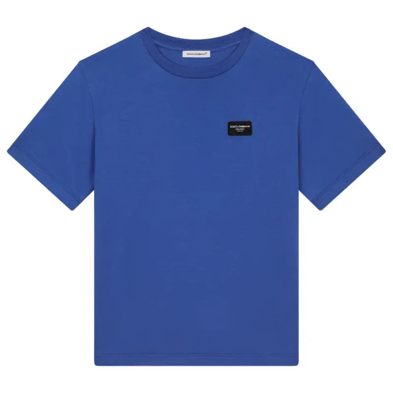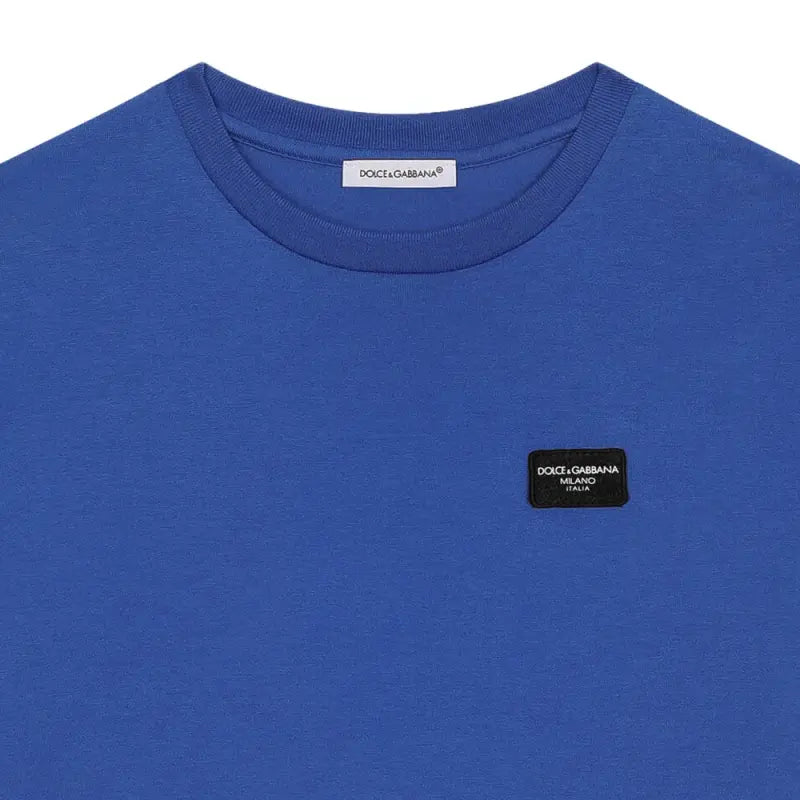 Bright blue T-shirt by Dolce & Gabbana, with the luxury Italian label's logo patch on the chest. It is made in soft and comfortable cotton jersey with a ribbed crew neck and short sleeves.