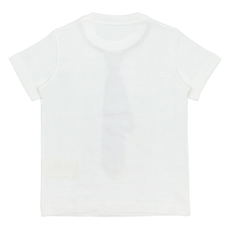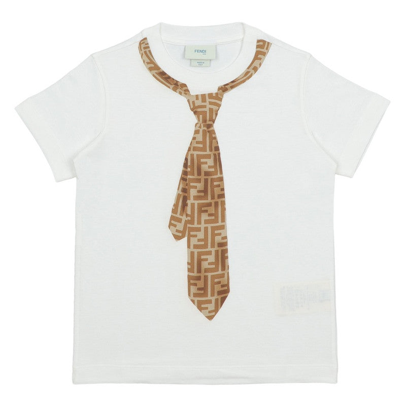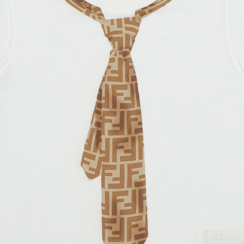 Short-sleeved junior T-shirt in white jersey with necktie trompe l'oeil print with all-over tone-on-tone beige logo.