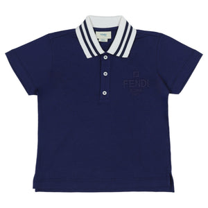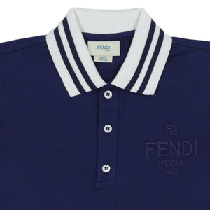 Navy polo shirt by luxury Italian brand Fendi, made in soft cotton jersey. Cool and comfortable, this classic style has a ribbed collar with a double blue stripe detail, and branded button fastenings. A raised Navy logo can be seen on the chest for instant brand recognition.
