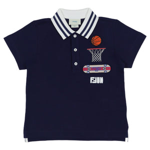 Playful navy polo with a striped collar and a unique basketball and skateboard appliqué featuring the embroidered Fendi Fun logo.
