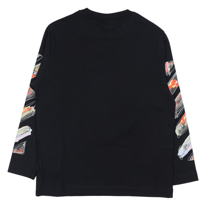 This comfortable black long-sleeve tee features a unique, multi-colored sketched Off-White logo across the chest and matching abstract graphic detailing down the sleeves for an artistic, high-fashion statement.