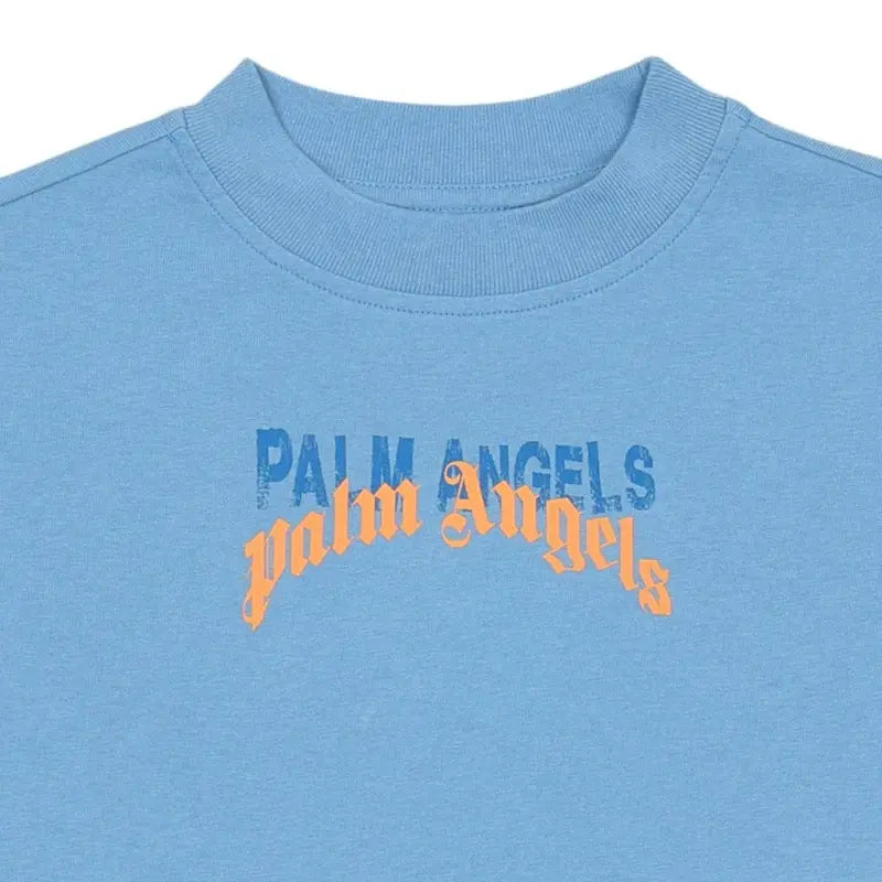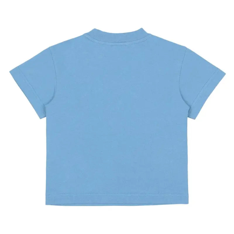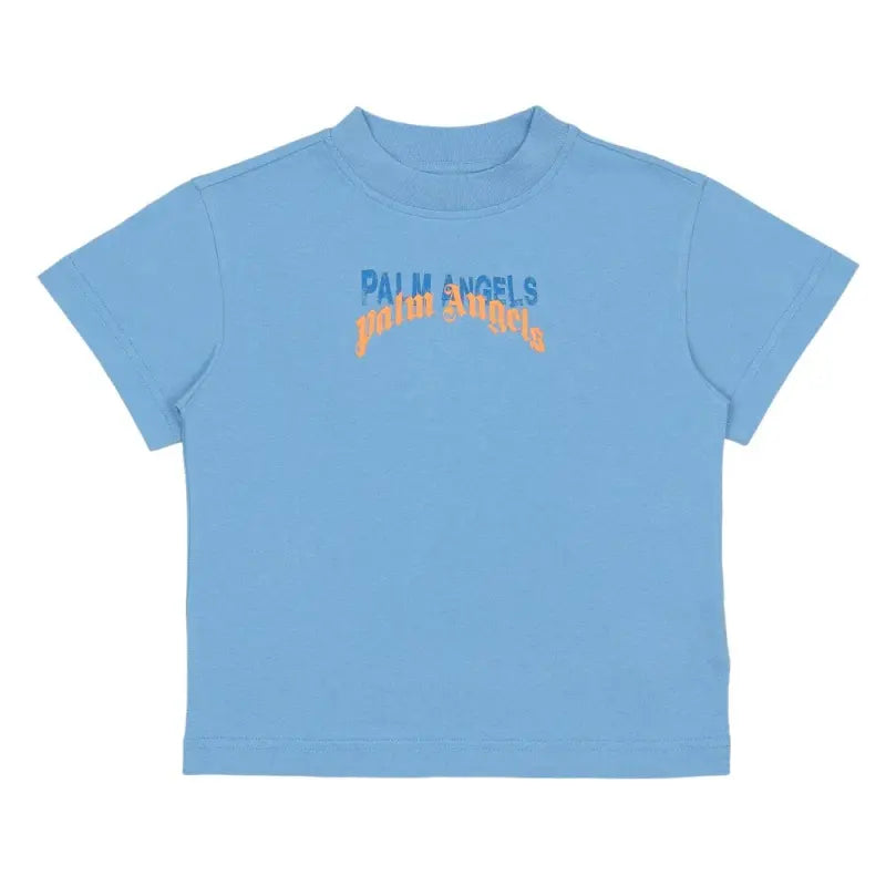 Logo in different touch-and-feel versions. Children's powder blue short-sleeved T-shirt with double logo print on the front, screen-printed in blue and Curved logo puff printed in pale pink overlapped.