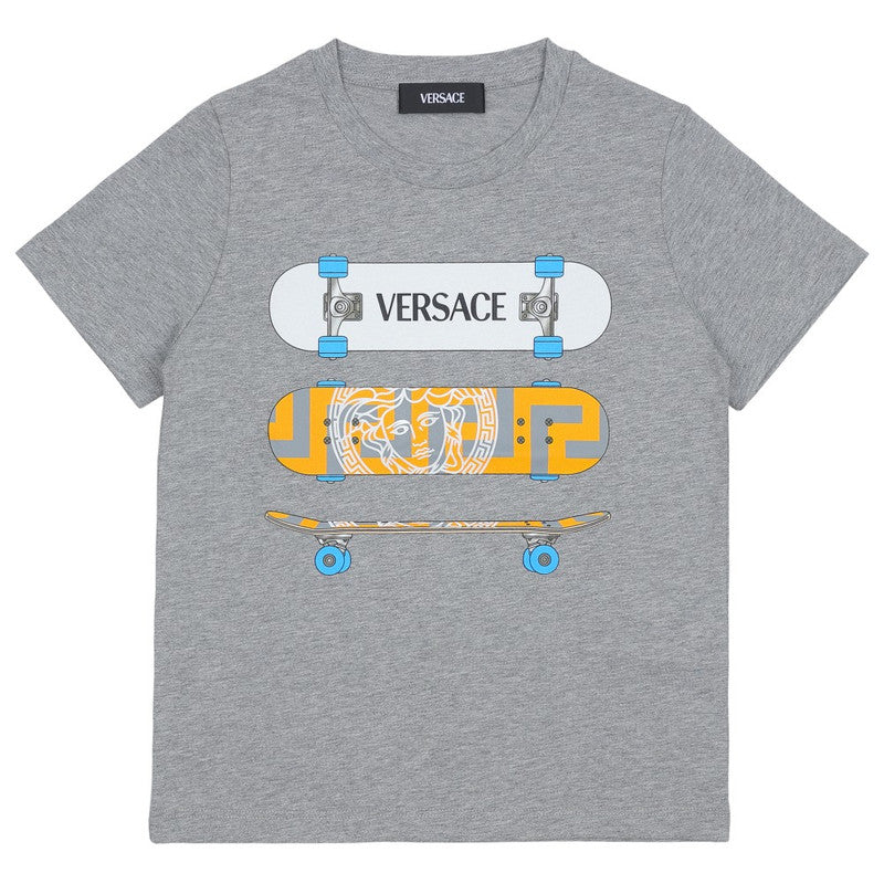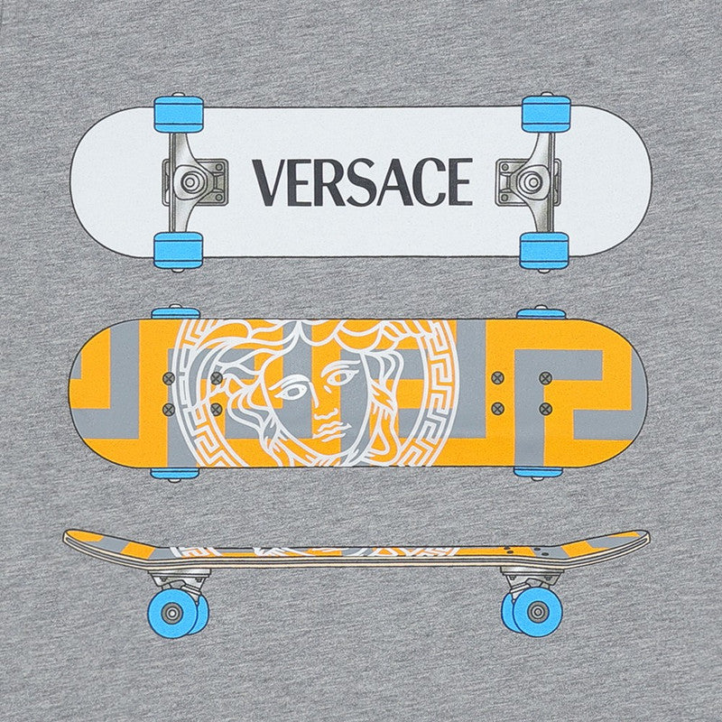 A short-sleeved cotton T-shirt with a Versace Logo graphic featuring Medusa and Greca Skateboard motifs.