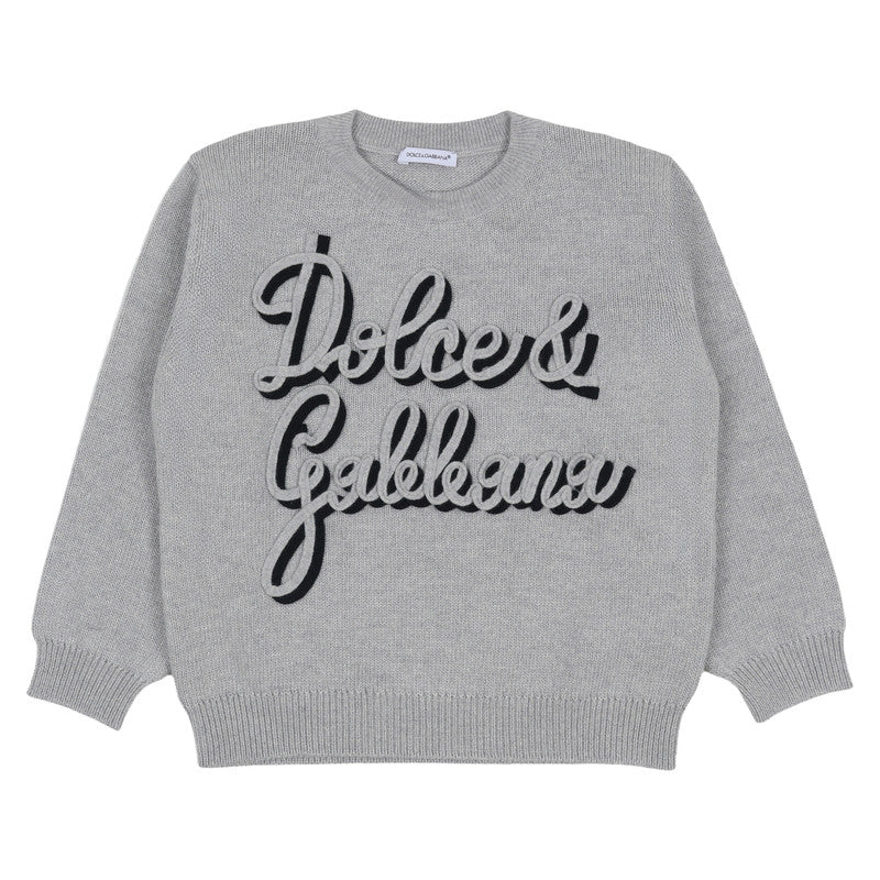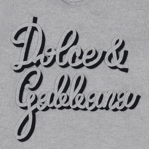 Soft grey wool sweater featuring the bold, iconic Dolce & Gabbana script logo in black applique. A luxurious piece for superior comfort and effortless designer style.