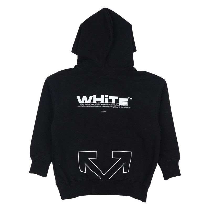 This stylish black Off-White hoodie combines comfort with a modern streetwear look. The hood offers extra warmth and a casual look. The white "OFF" lettering appears on the front, creating a subtle yet recognizable brand identity. The back features a playful design: the "White" lettering appears at the top with lowercase letters below, and the Off-White logo is halfway down the back.