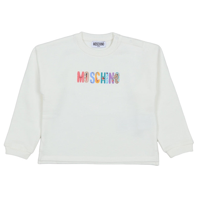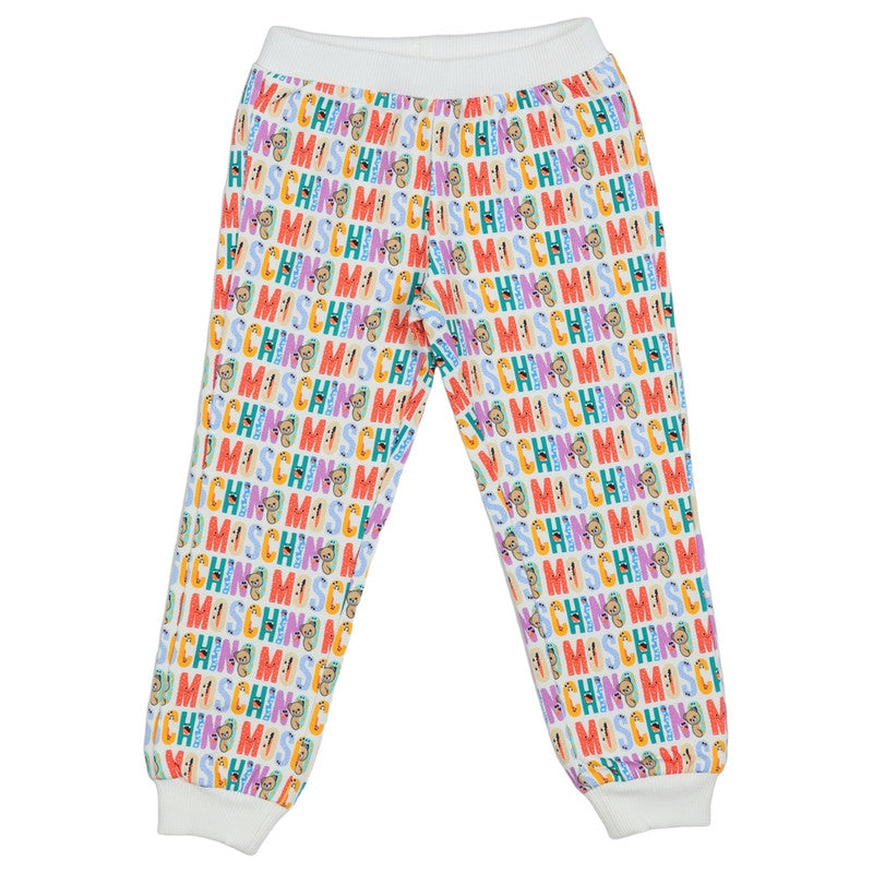 This Adorable Moschino Kids Tracksuit Includes A White Sweatshirt With A Colorful Logo Print And Matching Joggers Featuring A Vibrant All-Over Logo And Bear Motif.