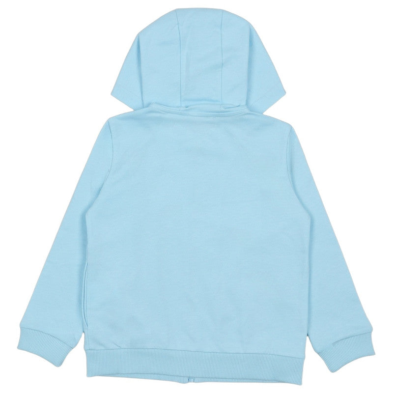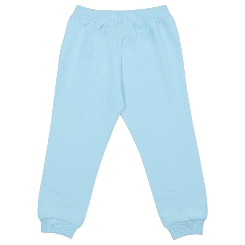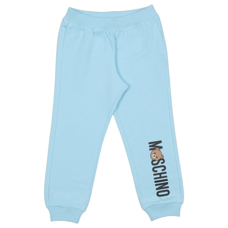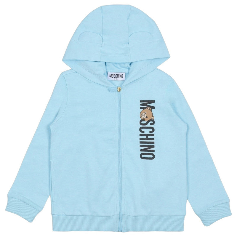 This Cheerful Moschino Tracksuit In Sky Blue Includes A Zip-Up Hoodie With Playful Bear Ears And Matching Joggers. Both Pieces Feature The Vertical Moschino Teddy Logo Print.