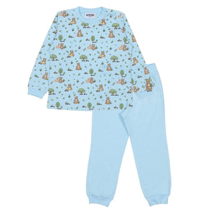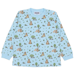 This Adorable Light Blue Moschino Tracksuit Set Is Perfect For Both Playtime And Naptime. The Soft, Long-Sleeve Top Features An All-Over Forest Print With Cute Teddy Bears And Trees, While The Matching Light Blue Joggers Have A Single Bear Motif On The Leg. With An Elasticated Waistband And Ribbed Cuffs, This Set Ensures A Comfortable And Secure Fit. Made From A Breathable Cotton Blend, It’S A Cozy Choice For Your Little One.