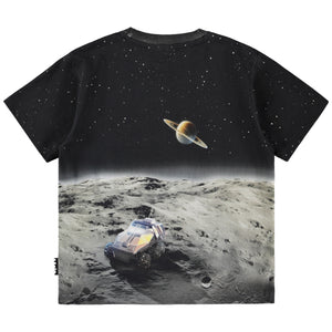 A black organic cotton T-shirt by Molo, ideal for young space enthusiasts. Made in soft jersey, this casual top is printed with a striking space scene, featuring the surface of the moon, planets and an astronaut.